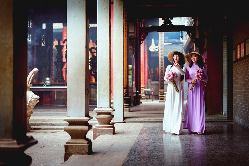 Beautiful vietnamese woman in Ao Dai white-traditional dress of vietnam, Ho Chi Minh city Vietnam