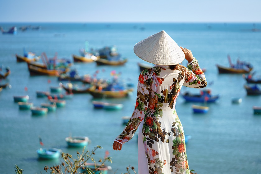 A tourist in Vietnamese traditional costume at the fishing village in Mui Ne, Phan Thiet