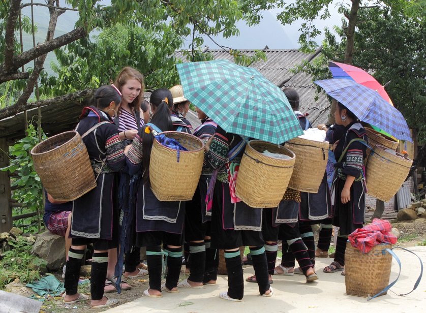 Group of Hmong children in Sapa surrounding a tourist