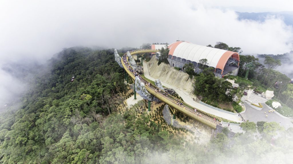 The Golden Bridge or Cau Vang is a beautiful golden bridge featuring two massive hands magically holding the bridge. It’s positioned on top of the Ba Na Hills in Da Nang, a beautiful coastal city in the central part of Vietnam.