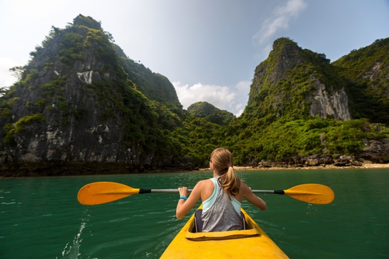 Lady exploring Ha Long Bay (UNESCO World Heritage Site) by kayak. Vietnam