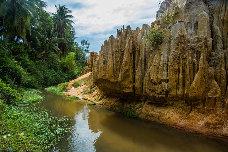 If you like amazing vibrant colors you are going to really enjoy walking up the Fairy Stream. This is a favorite free activity for visitors to Mui Ne. The stream originates from an underground spring that bubbles up from below the neighboring sand dunes at a spot next to Highway 706 about 18 kilometers northeast of Mui Ne. The spring turns into an ankle high stream running between the desert hills on one side and a green jungle with palm trees on the other. These spectacular hills, are painted a vibrant red-orange color contrasted against the chalky white hills which were cut out over centuries into fascinating stalakite shapes. The result has a mesmerizing romantic effect which you are going to love.