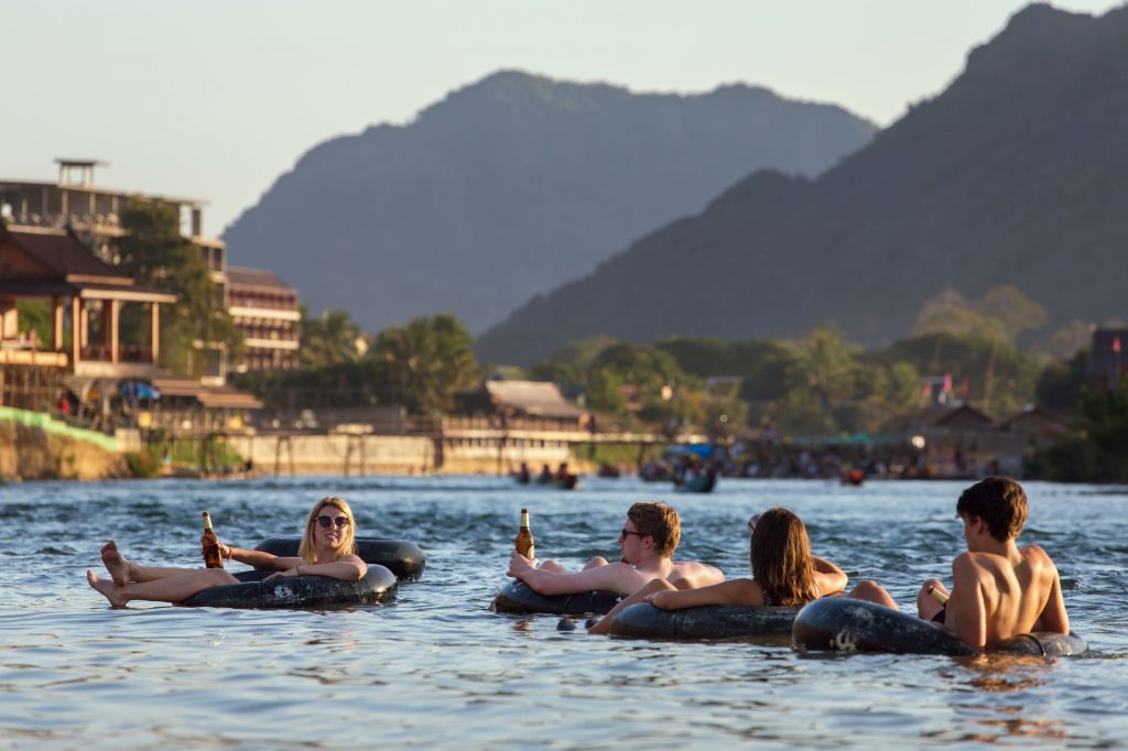 Before the Laos Government’s crackdown in 2012, tubing revolved around a wild drunken party frequented by hundreds of youthful backpackers swarming Vang Vieng from all over the world. Tubing included spending the afternoon floating down river from one shanty bar to the next, consuming alcohol and drugs to excess. With loud music blaring, there soon was added rope swings, giant water slides and “zip-lines” installed by the bars as a way to attract the inebriated, half-naked tubers who were floating down the river, inviting them to stop at their particular bar and party. The water challenges enticed the zozzled tubers to take their risky chances with the often too shallow and rocky river bottom below and soon lead to a disastrous conclusion.